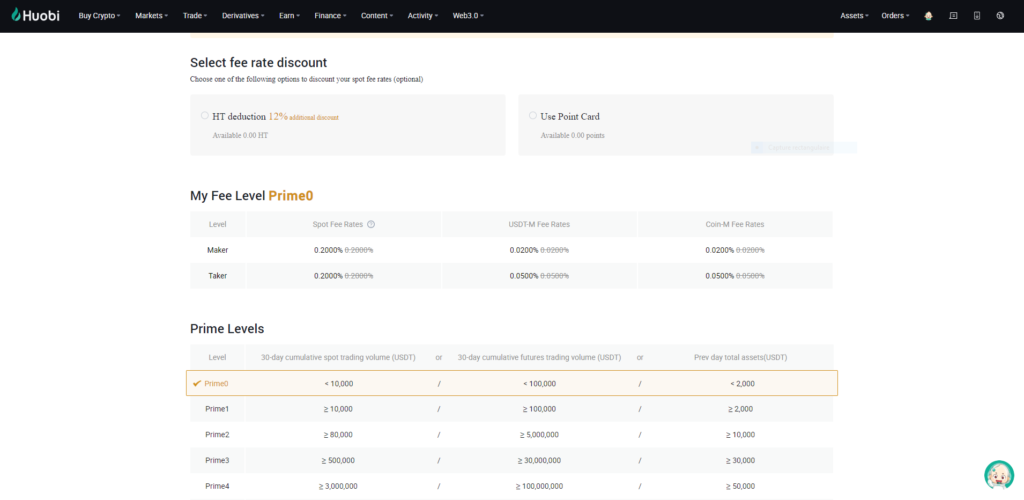 Huobi uses a tiered pricing structure based on the number of Huobi Tokens (HT) held by customers. If the trader’s HT is less than 10, a base rate of 0.2% will be applied and the additional fees will be reduced: