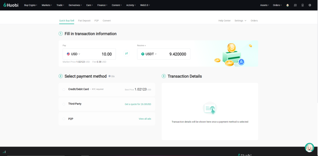 First, go to Huobi, then in the interface, click “ Buy Crypto ” and “ Quick Buy/Sell “.