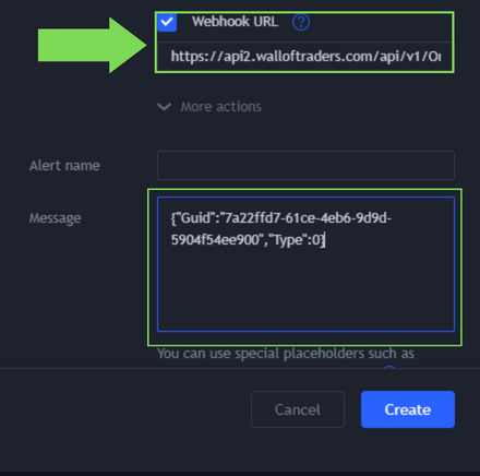Now click on “ Webhook “, then paste “ Webhook URL ” previously copied on Wall Of Traders as well as the “Message” in the Message field.
