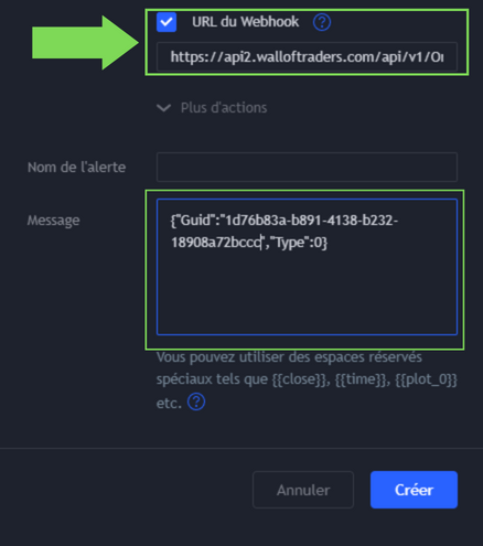 Cliquez maintenant sur « Webhook« , puis collez « l’URL du Webhook » précédemment copiée sur Wall Of Traders ainsi que le « Message » dans le champ Message.